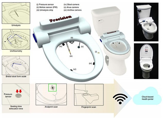 這款馬桶上裝了很多個攝像頭、測試分析條、壓力感應器,直接變成了一款「高科技設備」。