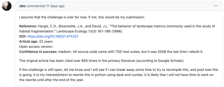 比如第一個參與人 John (EBo) David 提交的代碼,寫於 22 年前,名為「The behavior of landscape metrics commonly used in the study of habitat fragmentation」(常用於生境破碎化研究的景觀度量的行為)。