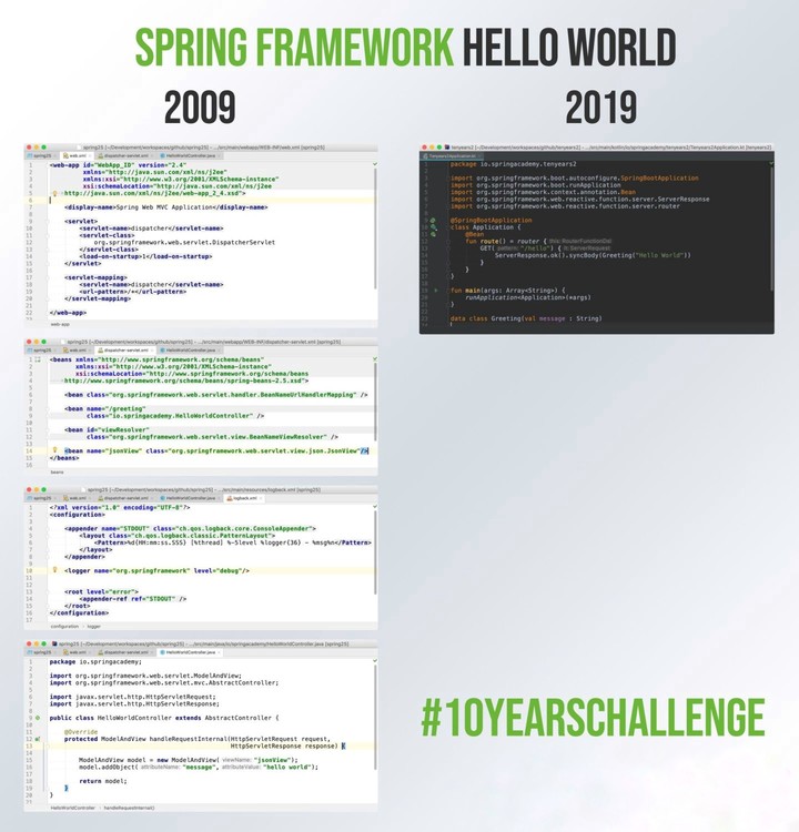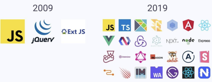 2009 年,Spring 需要若干 XML 配置和 Java 文件,而 2019 年只需要一個 Java/Kotlin 文件就可以。十年前前端只有 Plain Old Javascript、jQuery、ExtJS 可選,而如今就有二十多個選項。