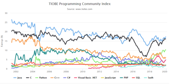 ▲ 2002 年到 2020 年編程語言趨勢圖. 圖片來自:TIOBE