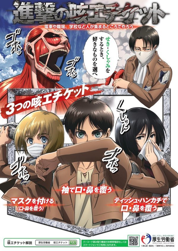 在 2017 年,負責健康、醫療等社會福利的日本厚生勞動省還和動漫作品《進擊的巨人》聯動,推廣「咳嗽禮儀」。(厚生勞動省還曾和很多動漫聯動宣傳公共健康信息,譬如找 《城市獵人》去叫人打風疹疫苗,《美少女戰士》去宣傳性病預防等等。)
