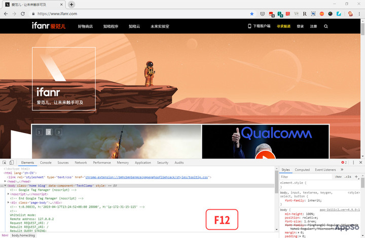 Chrome 原生的截圖功能隱藏在開發者工具中,Windows 平台按下 F12 快速調出開發者調試工具界面(macOS 系統快捷鍵為 ⌘Command + ⌥Option + I)