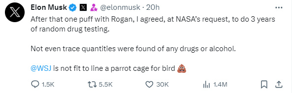 今年年初,華爾街日報引述知情人士消息稱,馬斯克濫用藥物的行為令其公司高管和董事會成員感到擔憂。馬斯克隨後在其社交媒體平台 X 上大罵華爾街日報「不配給鳥當廁紙」。