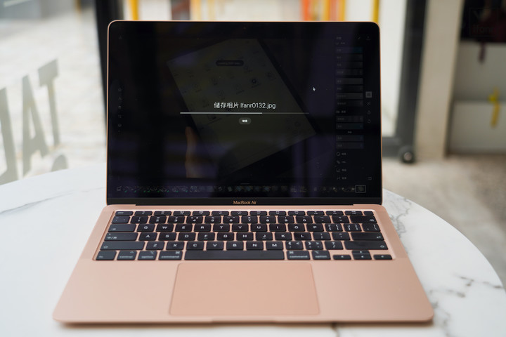 除了散熱問題,我還讓修圖工具幫我給 50 張 Raw 格式照片打水印、加濾鏡,作為參考物的 16 英寸 MacBook Pro(i7-9750H)耗時 2 分 15 秒,MacBook Air(i5–1030NG7)耗時 2 分 26 秒,差距大概只是 10 秒左右,電腦發熱也不嚴重。