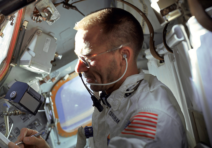 ▲航天員沃爾特・坎寧安 (Walter Cunningham) 在阿波羅 7 號上用 Fisher 太空筆書寫