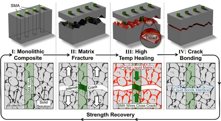 MMC 複合金屬由記憶合金增強材料以及低熔點材料組成,加熱時這些成分會將裂紋部分重新融合到一起。
