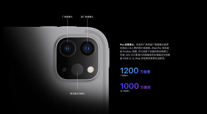 新款 iPad Pro 配備的是 1200 萬像素廣角鏡頭和 1000 萬像素超廣角鏡頭,支持與 iPhone 14 Pro 系列相同的智能 HDR 4 照片。