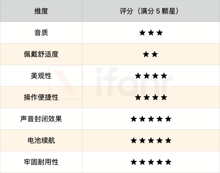 最後,我們回顧一下上述幾個方面,以單項滿分五顆星的方式,對這些項維度進行評分。