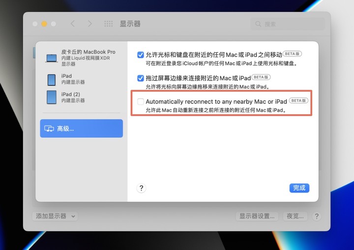 如果你的 3 台設備同時放在桌面上並解鎖,則會依次連接,好像並沒有順序。以我體驗為例,MacBook Pro 會隨機連接到 iPad Pro 或 iPad mini 上(但 iPad Pro 的次數多一些),然後將鼠標指針向 MacBook 屏幕的另一側邊緣移動,就可以連接到另一台 iPad 上了。