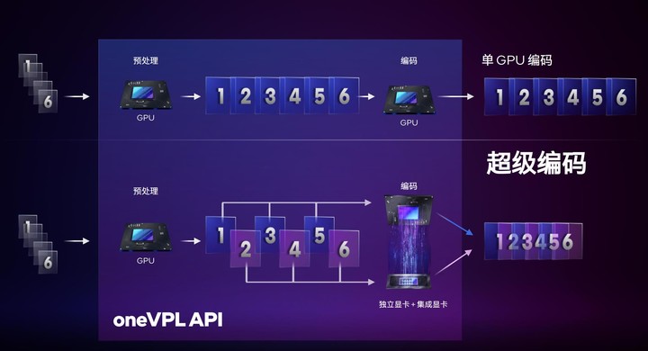 「超級編碼」也很好理解,由於 CPU 的核顯和 Arc 師出同門,在視頻編碼時兩者可以一起工作,分擔的獨顯的壓力,提高編碼的效率。