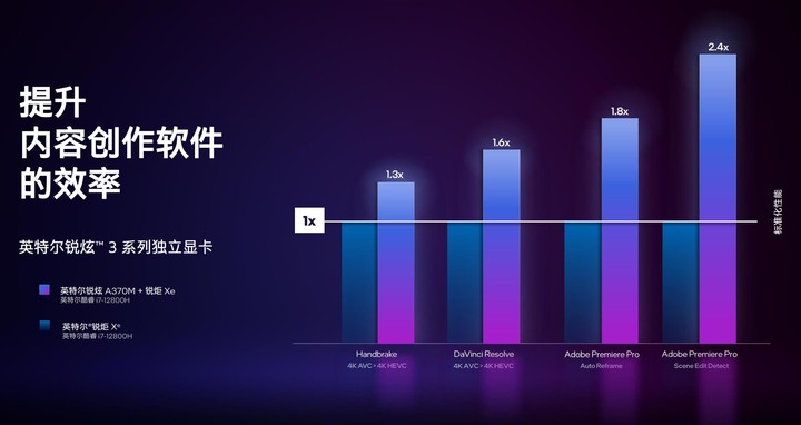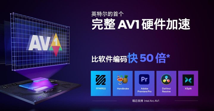 英特爾強調 Arc 是首款內置 AV1 硬件編解碼的顯卡,能夠為達芬奇、Premiere Pro、FFMPEG 等軟件提供 AV1 硬件加速,這有助於推動 AV1 標準進一步普及。