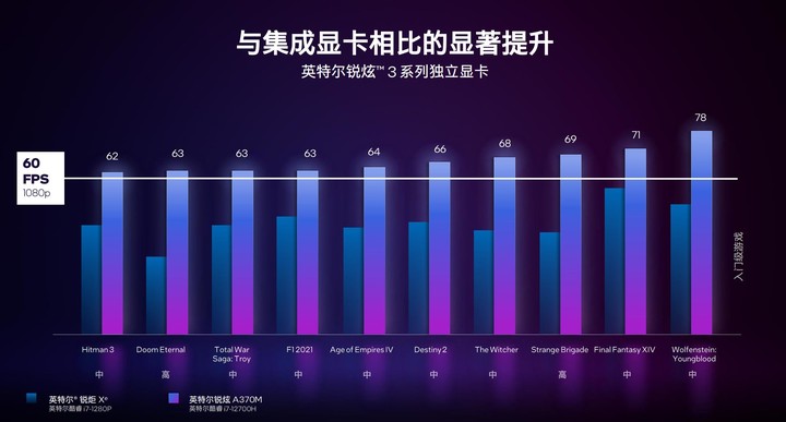從英特爾公佈的遊戲測試來看,Arc 3 的 A370M 在 1080P 分辨率、中畫質的條件下可以 60FPS 的幀率流暢玩命運 2、巫師 3 等主流遊戲。