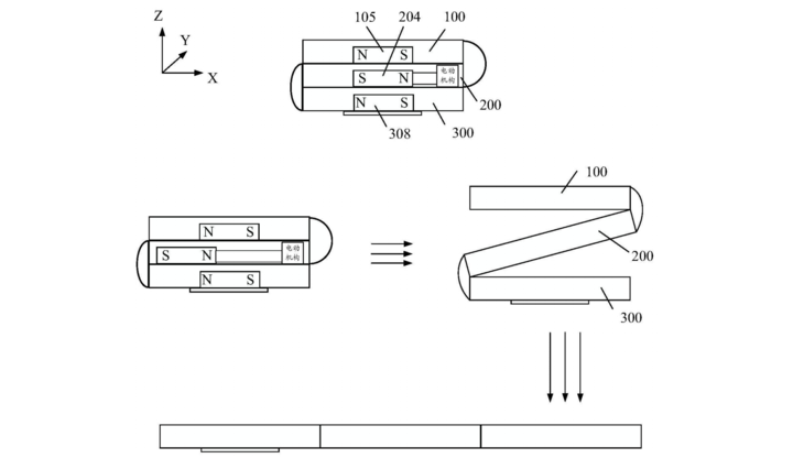 專利説明書還提到了通過一個開關自動展開摺疊屏的操作方式,這主要利用了殼體中的磁性部件之間的相互作用實現。顯然,多加一塊屏幕意味着每次展開/閉合都要多一步操作,而利用磁吸的助力或許是個不錯的選擇。