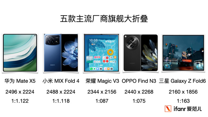 但大摺疊內屏卻與手機和平板電腦截然不同,目前市面上比較主流的幾款大摺疊,展開後內屏長寬基本都是接近 1:1 的比例:
