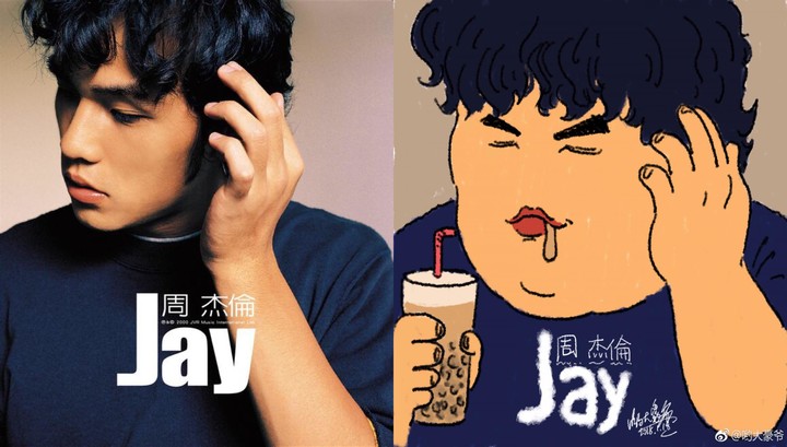 ▲ 哎喲,腦殼有點疼,是美食「勾引」的我. 圖片來自:周杰倫專輯 Jay(左),喲大豪爺/微博(右)