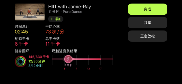 個人覺得這是 Fitness+ 的最大優勢,用户不需要過多的思考,打開 iPhone 和 Apple Watch 就可以開始健身, 健身數據實時展示在 iPhone 或 iPad 上,運動完可以在 iPhone 或 Apple Watch 上覆盤數據。