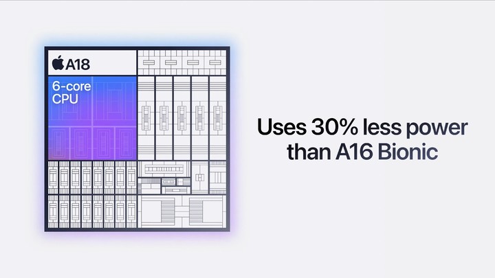 並且,A18 擁有 6 核 CPU,包含 2 個性能核心和 4 個效率核心,比 iPhone 15 中的 CPU 快 30%,而在同等性能下,功耗可以減少 30%。