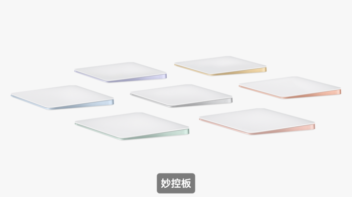 多彩的顏色是新 iMac 的亮點,隨機包裝的妙控鍵盤和鼠標也和機身一樣擁有 7 種多彩的顏色,而額外添置的觸控板同樣有 7 種彩色選擇,可以説蘋果將「搞顏色」進行到底了。