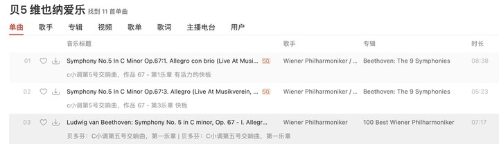 但第一步不必總是有頭有尾。搜索「貝多芬 5」, 貝多芬和五有關的作品都被篩選出來,如第五交響曲、第五鋼琴協奏曲、第五小提琴奏鳴曲,範圍已經大大縮小了。搜索「貝多芬 Op. 67」或者「貝多芬 命運」,結果更為精準。