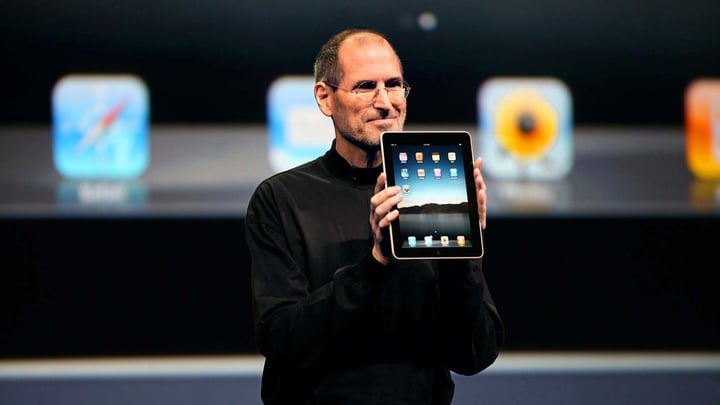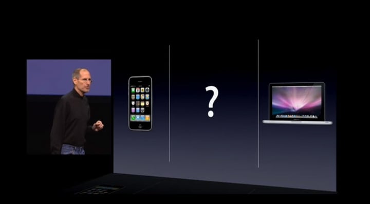 2010 年 1 月 27 日,喬布斯以一貫的演講風格來為 iPad 的登場做鋪墊。就和初代 iPhone 的發佈節奏一樣,它在幻燈片上放了一台 iPhone 和一台筆記本電腦,中間標了個問號。