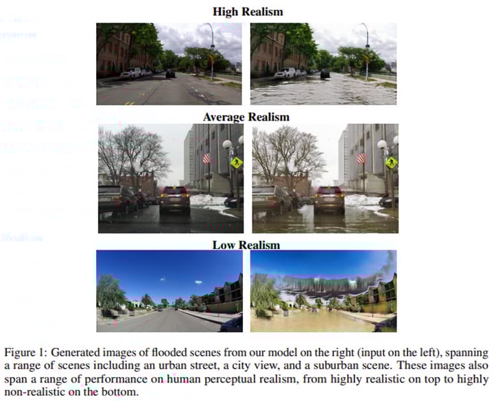 研究人員輸入不同位置和建築類型(如房屋、農場、街道、城市)的圖像,形成十多種人工智能合成樣式,再請評估人員在真實圖像和半生成圖像之間進行選擇,計算平均錯誤率。這項工作的最終願景是創建機器學習架構,根據用户選擇的位置生成極端天氣下的最逼真圖像,包括洪水、山火、熱帶氣旋乃至更多的災難性事件。