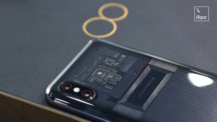 小米 8 透明探索版就採用了一個折中的方式,在手機內部增加一層裝飾電子蓋板,事先設定好各個裝飾元器件的排布,以此保證後蓋美觀性。