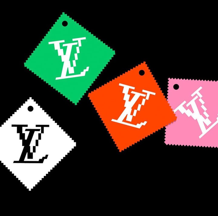 奢侈品牌路易威登(簡稱 LV),也被襯線體 Mondwest 改造出五顏六色的菱形小吊牌。