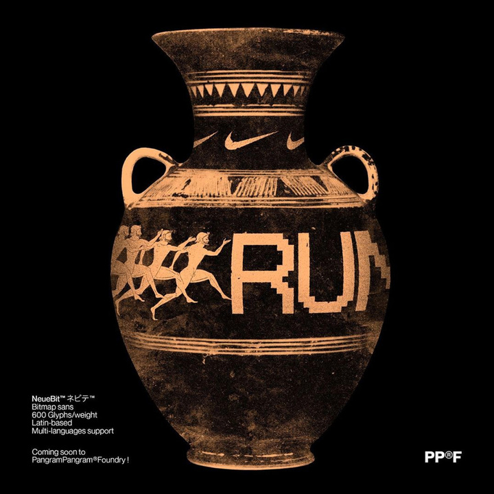 無襯線體 Neuebit,還與 Nike 的 logo 一起出現在古董陶器上,好像是某本古董拍賣書冊裏的一頁。