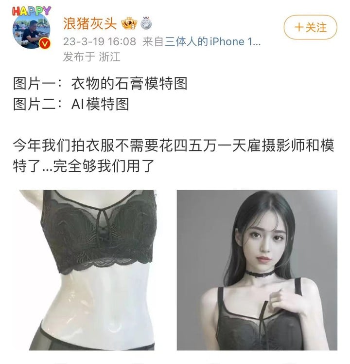 電商從業者 @浪豬灰頭 也是能和 AI 親密合作的類型。只需要把產品圖放到石膏上進行拍攝,在讓 AI 輸出圖片,商家就已經能夠得到一張完成度很高的模特展示圖了。在這個過程中,攝影師不需要了,模特不需要了,修圖師也可以被替代了。