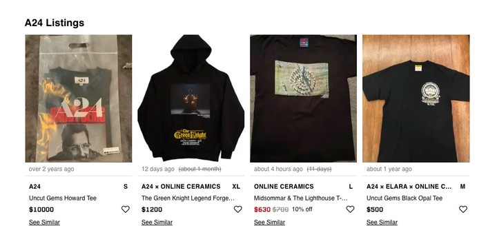 在潮牌二手網站 Grailed 上,一件「絕版」A24 電影 T 恤甚至能從售價幾十美元被炒到幾百上千。