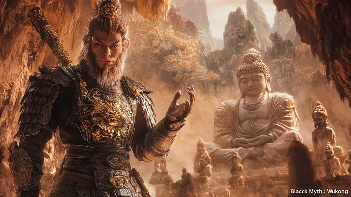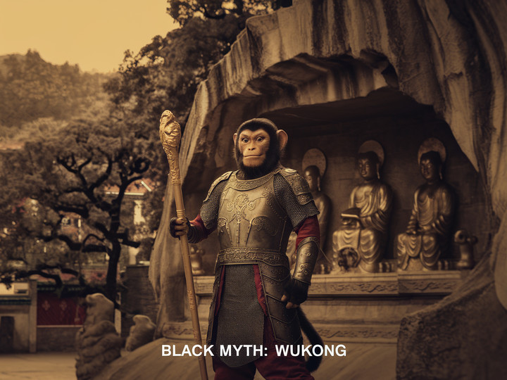 這次走寫實風格,並且規定了比較詳細的場景,大聖身穿鎧甲,手拿金箍棒,神情肅穆,威風凜凜,站在佛窟前,温暖的橙色調,圖片底部寫着「Black Myth: Wukong」(黑神話:悟空)。