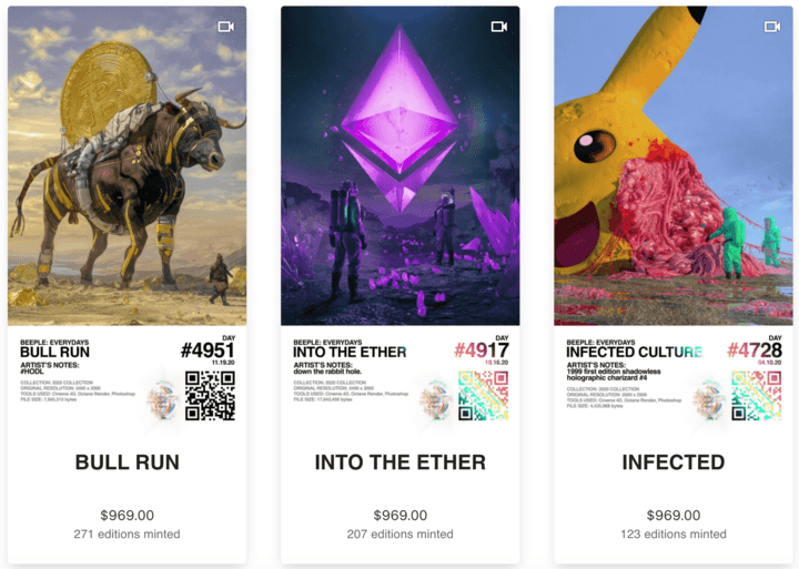 去年 12 月,Beeple 就嘗試將自己的作品以 NFT 的形式放到區塊鏈藝術平台 Nifty Gateway 上拍賣,最終 22 幅作品全被拍下,最貴的一件作品以 77 萬美元售出,所有作品總價達到 350 萬美元。