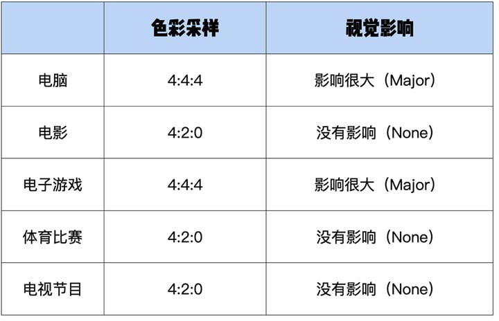 不過,雖然顏色損失很嚴重,但人眼對色度不敏感到,即使丟失了 75% 的信息,正常環境的畫面也不會感到有什麼問題。