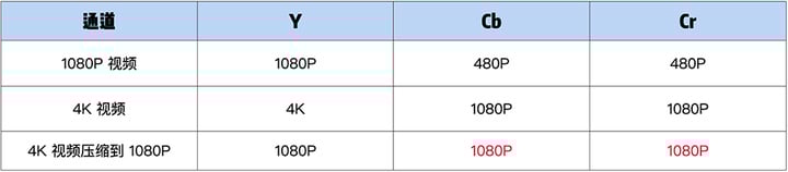 我們日常在網絡上看到以 4:2:0 標準壓縮的 4K 視頻,擁有的就是一個沒有動刀的 4K 分辨率 Y 通道,以及被壓縮色度信息到 1080P 的 Cb 通道和 Cr 通道。