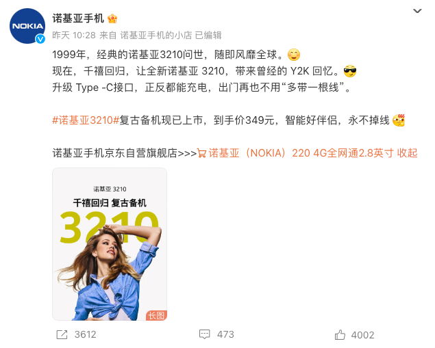 時至今日,我們的生活已經很難離開智能手機。諾基亞 3210 4G 的出現,給手機領域又增添了一抹不一樣的色彩。關於其市場反饋,已經可以從諾基亞這條微博轉放量窺見一斑。