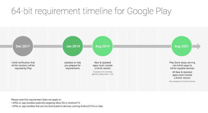 比如 Android 此前宣佈,自 2019 年 8 月起,所有 Google Play 裏的應用都需要支持 64 位。從 2021 年 8 月 1 日起,64 位設備上的 Google Play,將不再提供 32 位版本的應用。
