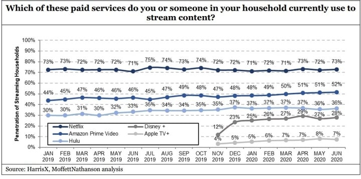 分析機構 HarrisX 還專門調查了 8500 位美國的成年用户,數據結果顯示,截止到 2020 年 6 月,蘋果 Apple TV+ 在美國地區的使用率僅為 7%,不僅比不過另一個新平台迪士尼 Disney+,也遠低於 Netflix、亞馬遜 Prime Video 等老牌流媒體服務商,整體態勢並不樂觀。
