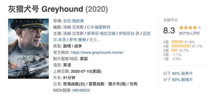 在豆瓣上,《灰獵犬號》已經獲得了超過 3.2 萬人的打分,綜合評價為 8.3 分,放在戰爭片類型中算是個不錯的成績。