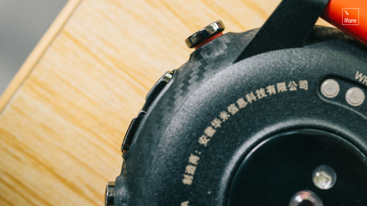 機身用上了類似碳纖質感的細節處理,三個按鍵都做了坑紋不同的處理,方便用户識別和操作。而手錶的底殼,則用上了磨砂處理。