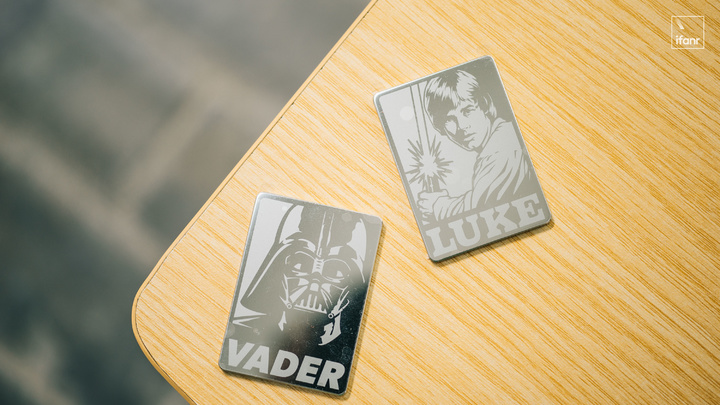 內包裝的上層放着兩塊星戰紀念金屬牌,上面印着 Luke Skywalker 和 Darth Vedar 這對經典的父子組合。