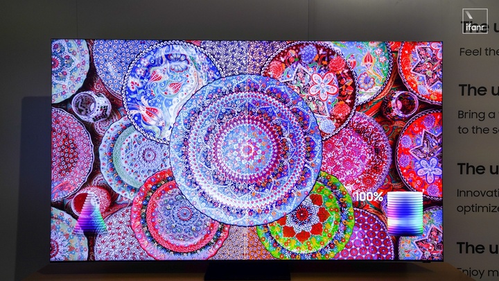 在展台的另一端,三星還放出了一個左右半屏的色彩對比展示,而三星的量子點屏幕色彩確實會讓人印象深刻,但這些效果仍然是在現場觀看最明顯,光看圖片可能會打些折扣。