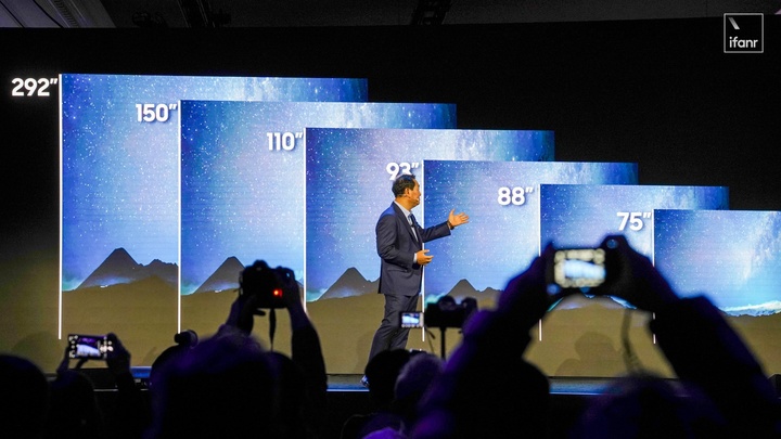 在現場,三星也展出了最大 292 英寸的巨幕,但這種超大型屏幕主要還是面向演唱會、户外廣告等商業場景,對家庭用户來説,現在可以選擇的 Micro-LED 電視尺寸分別有 75、88、93 和 110 英寸等,。