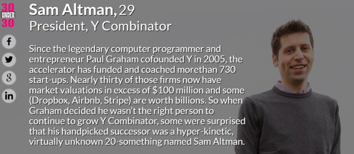 2015 年,Altman 入選了福布斯 30 位 30 歲以下風險投資榜單。風險資本家 Marc Andreessen 這樣評價他:
