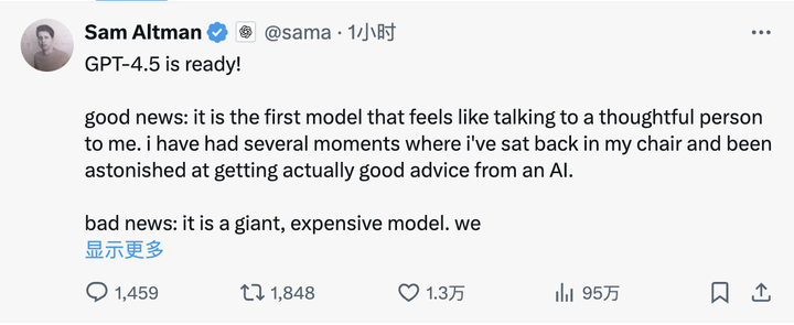 不過,他也特別提醒,GPT-4.5 不是推理型模型,不會在基準測試中碾壓其他模型。而他之所以沒有亮相發佈會,原因是在醫院照顧小孩。