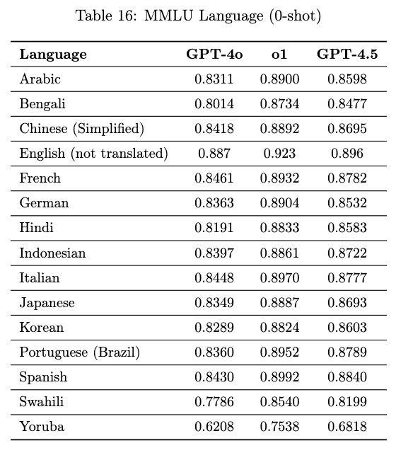 多語言性能方面,GPT-4.5 支持 14 種語言,在 MMLU 評估中超越了 GPT-4o,尤其在低資源語言(如斯瓦希里語、約魯巴語)上有明顯提升。