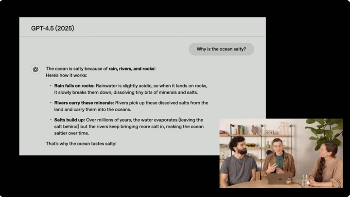 另一個演示則展示了 GPT-4.5 在解釋複雜問題上的能力,「為什麼海水是鹹的?」