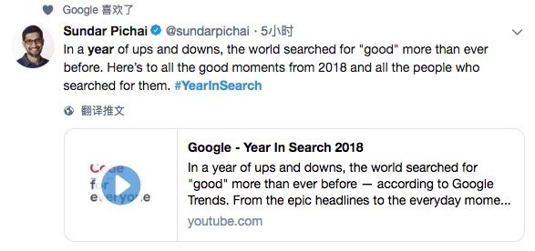 Google CEO Sundar Pichai 在轉發年度視頻的 Twitter 上説道: