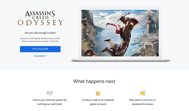 按照官方的説法,玩家只需要藉助桌面端的 Chrome 瀏覽器,就能立即玩到《刺客信條:奧德賽》這樣的 3A 遊戲,而無需再下載四五十 GB 的遊戲內容。
