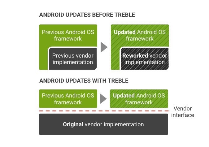 為了進一步減少 OEM 廠商們適配新系統的工作量,繼續降低 Android 的碎片化,Google 在 2017 年(Android 8.0)引入了名為「Project Treble」機制。