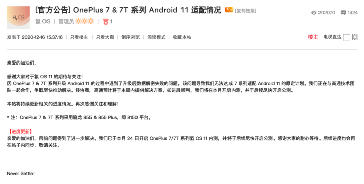 ▲ 關於 一加 7 / 7T 系列 Android 11 適配情況的官方公告. 圖片來自:一加社區